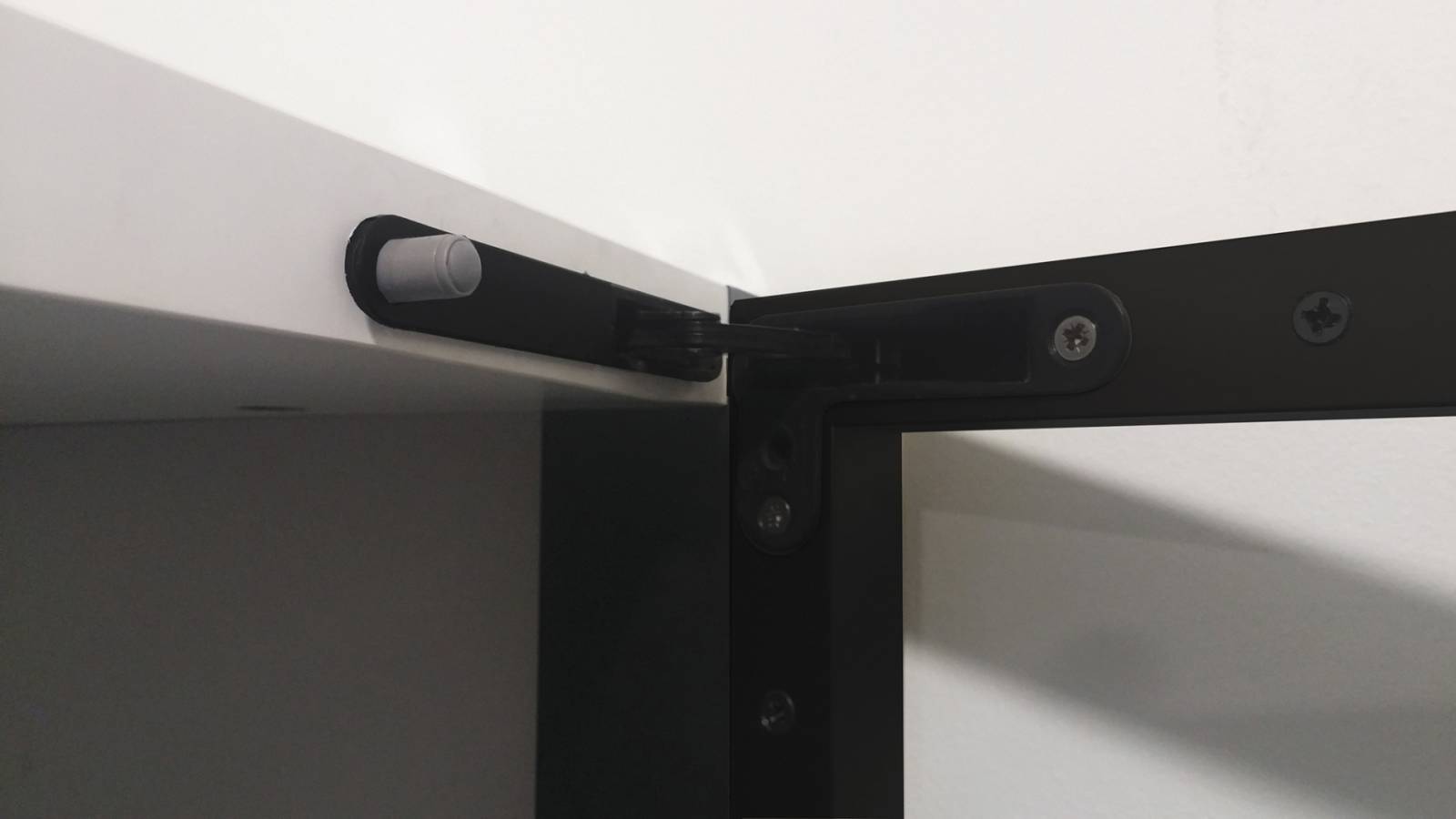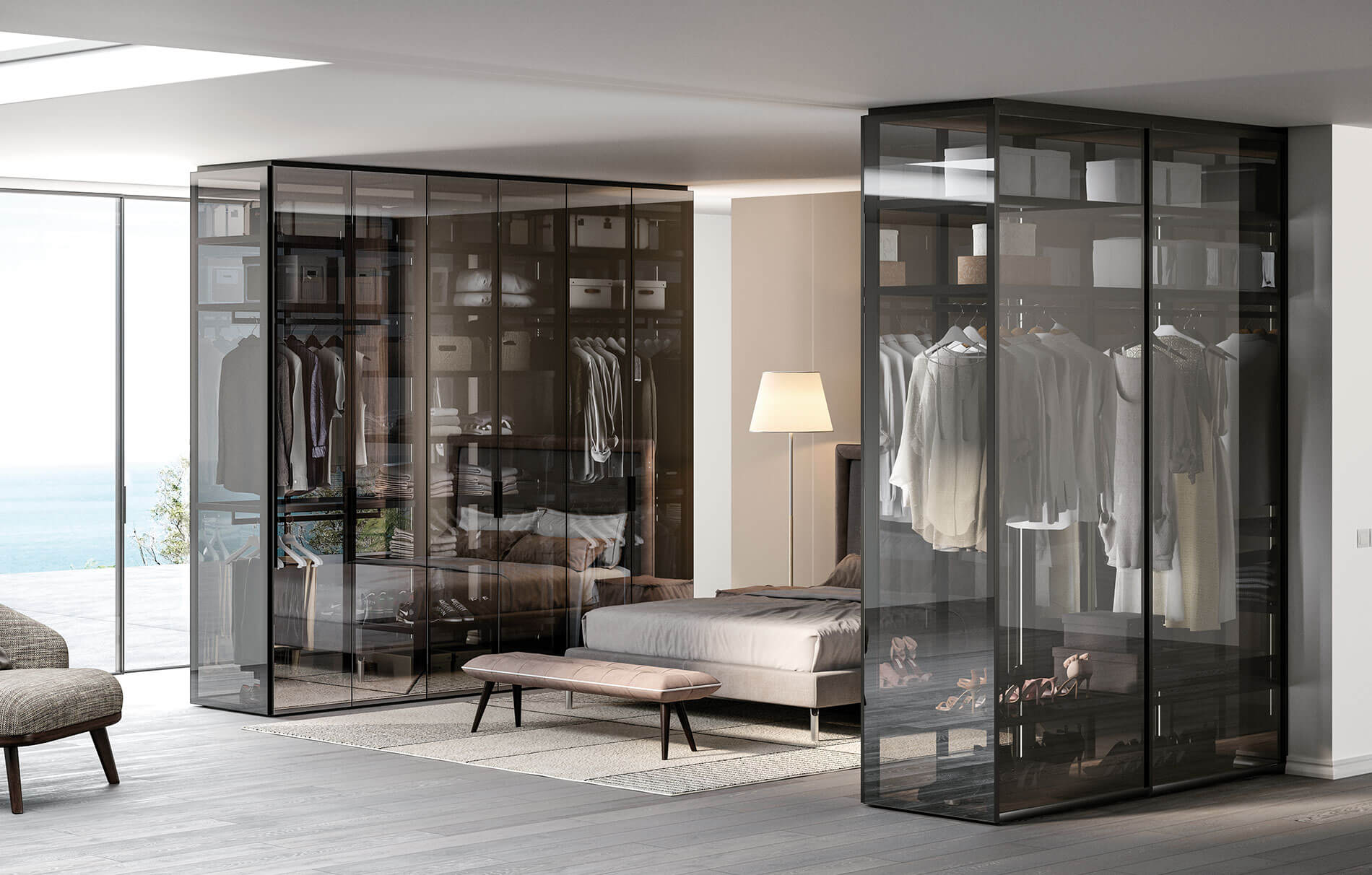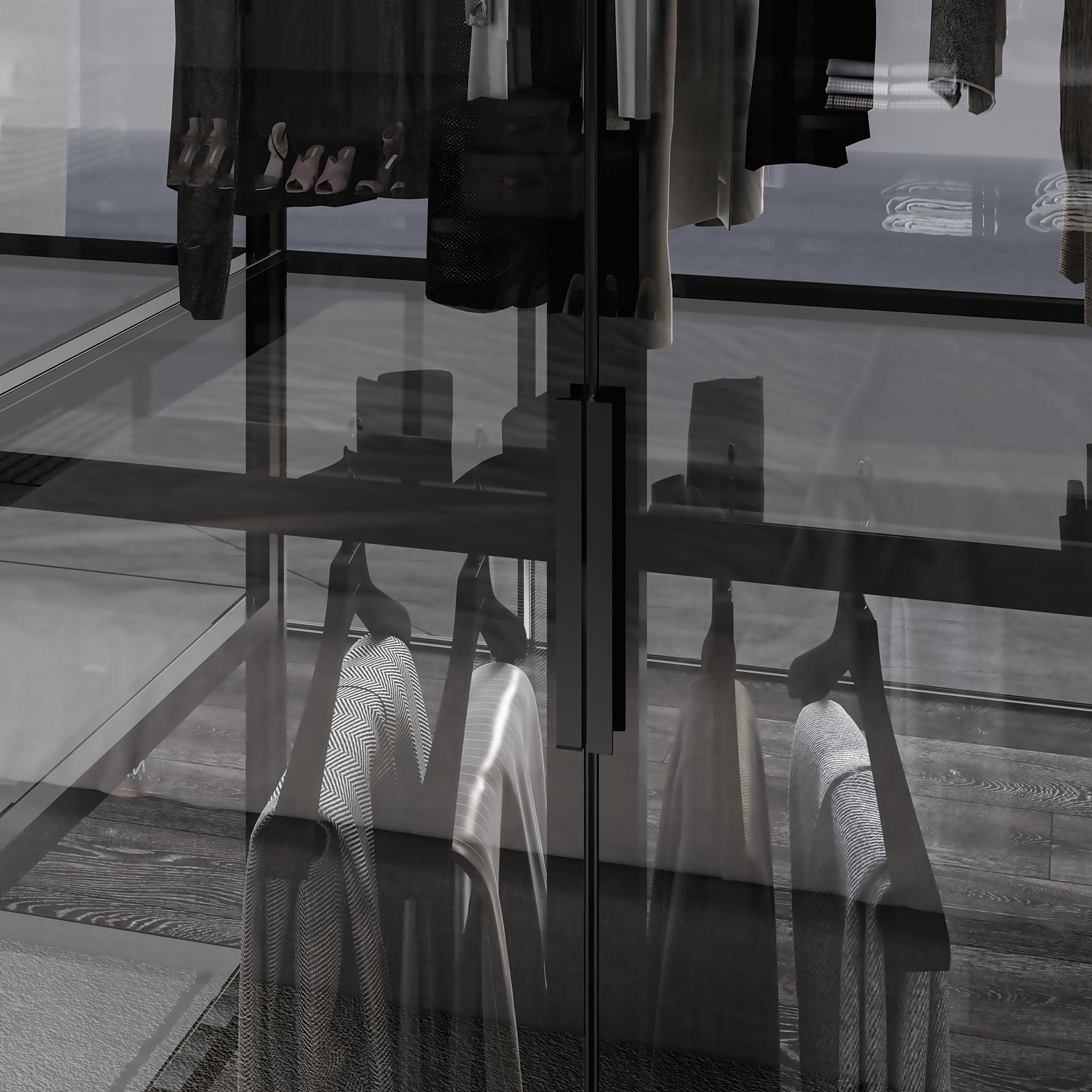 El sistema innovador de apertura de este modelo da como resultado un armario de puertas abatibles sin los clásicos herrajes vistos, ya que sus bisagras con freno están colocadas en el canto superior e inferior. Este sistema de bisagras permite un perfil oculto visualmente más estrecho.